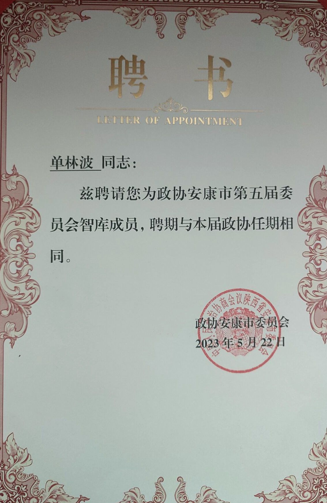 近日,安康市政协委员会发文并举行仪式,聘请公司单林波为安康市政协第五届委员会智库专家。