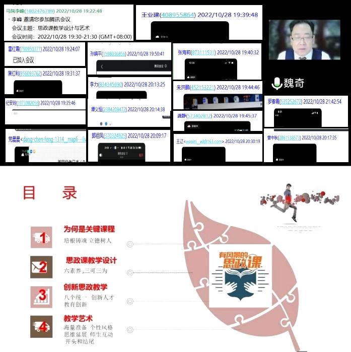 为深入学习党的二十大精神,全面贯彻党的教育方针,落实立德树人根本任务,“马原理”与“习近平新时代中国特色社会主义思想概论”教研室任课教师于2022年10月28日晚上开展了教研活动。首先通过腾讯会议由西北政法大学英国上市公司365经理魏奇做“思政课教学设计与艺术”讲座, 随后大家围绕讲座内容开展了心得交流。