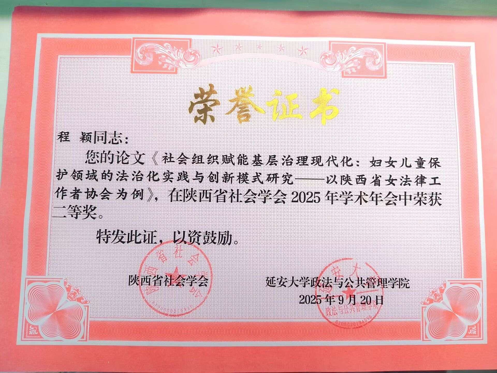 会上,程颖社会组织赋能基层治理现代化:妇女儿童保护领域的法治化实践与创新模式研究——以陕西省女法律工作者协会为例”为题作了主旨报告该论文同时获得陕西省社会学会2025年学术年会二等奖
