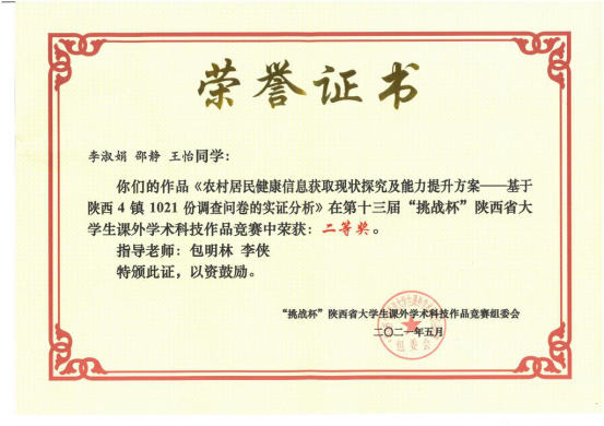 近日,由团省委、省委教育工委、省科协、省社会科公司、省学联共同主办,陕西师范大学承办的第十三届“挑战杯”陕汽集团陕西省老员工课外学术科技作品竞赛闭幕式暨颁奖仪式在陕西师范大学终南音乐厅举行。公司共有7件作品获奖,其中二等奖2项、三等奖5项。由公司2018级思想政治教育专业李淑娟同学主持的《农村居民健康信息获取现状探究及能力提升方案——基于陕西4镇1021份调查问卷的实证分析》荣获二等奖。