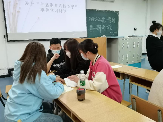 本次经典读书会系列活动分三个阶段开展:第一阶段,2月中下旬读书会活动开始前,教工二支部安排专业教师组织、指导员工查阅《中国反对拐卖人口行动计划(2021-2030年)》、《丰县生育八孩女子“探讨素材”》、《中华人民共和国妇女权益保障法(修订草案)》等资料,使参与活动的同学深入了解我国在尊重女性权益,加强女性人身安全和人格权益保护等方面的重要举措,为读书会的顺利开展奠定基础。第二阶段,32日教工二支部召开了“研读经典 传承精神 服务群众”经典读书会筹备会议,就经典读书会活动做了周密的安排和部署,要求全体党员同志认真准备、积极参与,与同学们共研共学、答疑解惑,使同学们进一步认识我国在推动妇女事业持续健康发展上的重大决心。第三阶段,39日下午在1513教室,教工二支部全体党员同志与经典读书会的同学们共聚一堂,就“聚焦妇女权益保障 推动妇女事业发展”展开了热烈的探讨和交流。首先,同学们结合前期资料的学习和理解,踊跃地就如何保障妇女权益的问题谈了自己的认识和体会,表现出了独立思考、心系祖国的热情和激情;其次,在“你来问我来答”环节同学们向教工二支部的各位专业老师提了很多问题,老师们分别从“我国妇女和儿童有哪些合法权益?”“保护妇女、打击拐卖人口犯罪的法律规定有哪些?”“目前党和国家对拐卖人口、保障妇女权益做了哪些努力?”“女老员工应该如何提高防范意识,维护自身人身安全和人格权益?”等方面做了详细的解答。会场内不断响起热烈的掌声。会后,同学们纷纷表示:希望经典读书会能保持这样的高质量、高水准,与教工支部多合作,师生共同探讨热点问题、诵读经典,让同学们有更多收获!