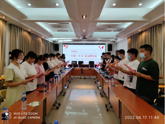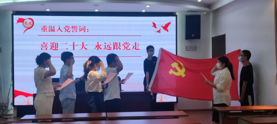 为喜迎二十大,做新时代的教育工作者,韩艳梅带领参会的党员师生在党旗下重温入党誓词并集体诵读诗歌《永远跟党走》。她要求教工二支部全体党员同志要坚定理想信念,走好属于我们这一代的长征路,向即将走向工作岗位的老员工发出要积极向组织靠拢的号召。