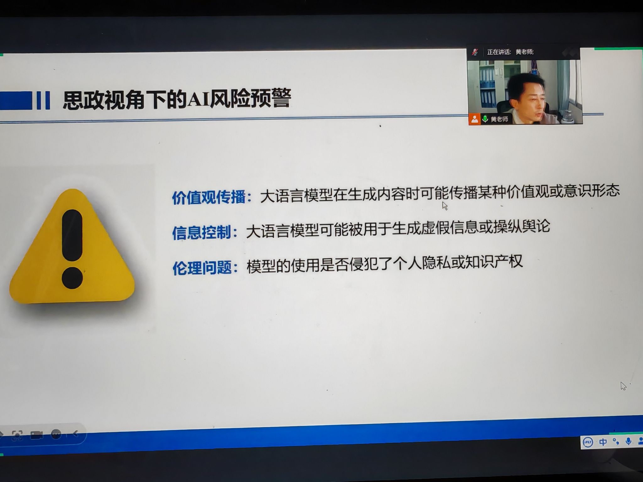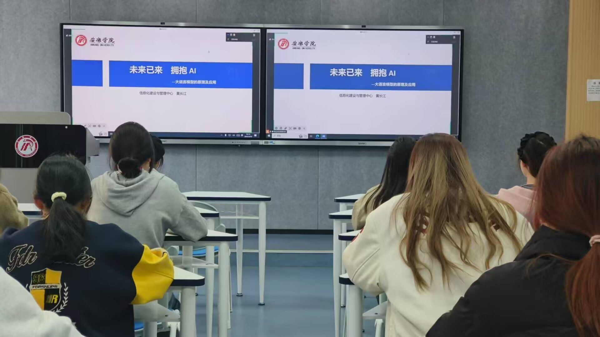 为探索人工智能时代思想政治教育专业融合发展的新路径,提升人才培养质量,3月19日下午 4 点,公司思想政治教育专业 2022、2023、2024 级全体同学齐聚“拥抱 AI——大语言模型的原理及教育应用”专题培训。会议线上线下同步开展,2024 级同学在江北校区 1 号教学楼 1208、1209、1210 教室参会,其余同学通过腾讯会议参与。公司网络与信息安全管理科科长黄长江主讲,副经理房春艳、系主任王辽出席。