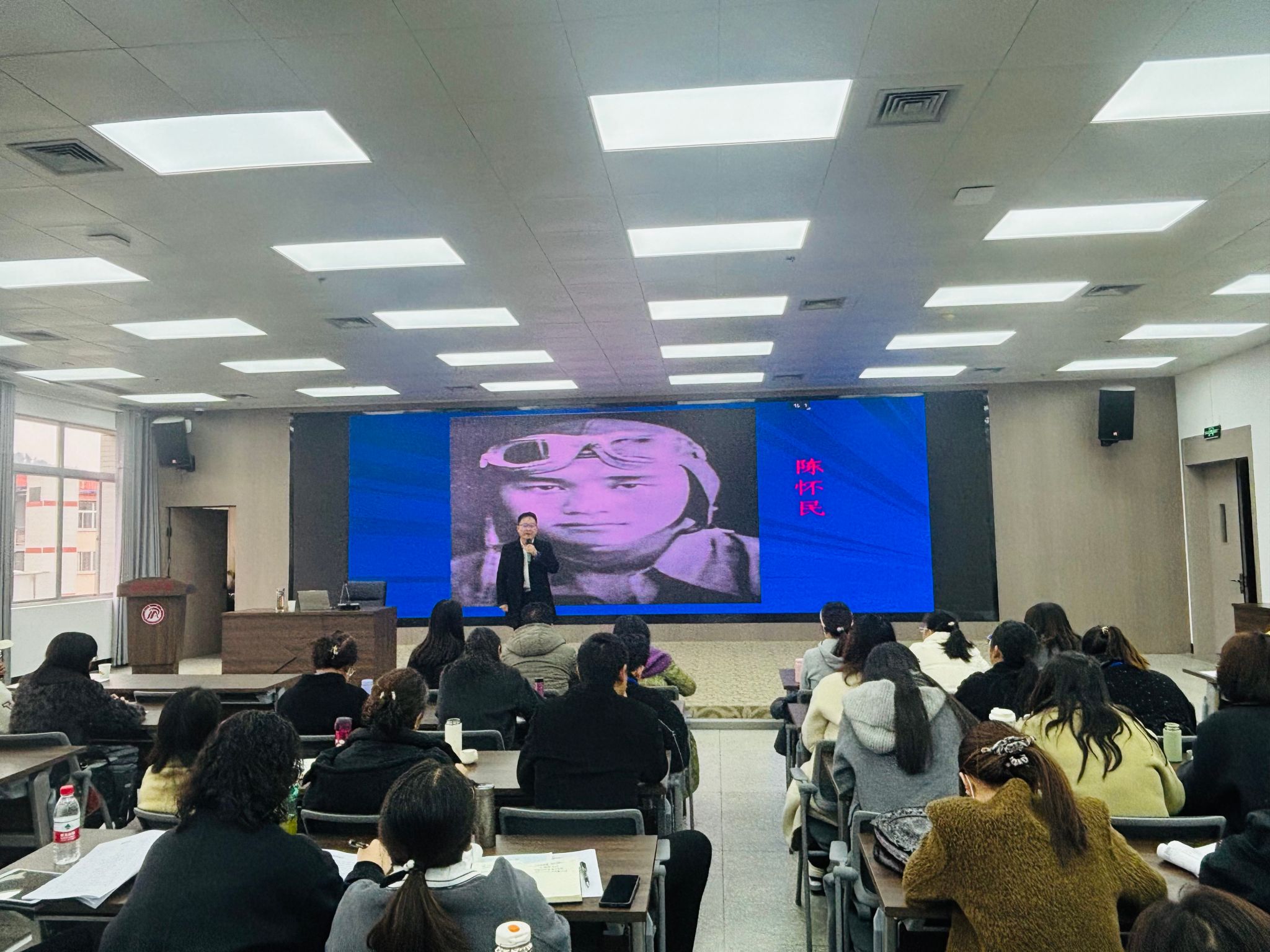 报告伊始,吴又存老师以亲历“3·18”座谈会的难忘时刻为切入点,深情回顾了新时代思政教师的使命与担当。随后,他围绕“坚定信仰,引导员工做热爱祖国的人”、“德法兼修,引导员工做尊德守法的人”、“诗词歌赋,引导员工做逐美而行的人”、“真情涌动,引导员工做求真向善的人”四个维度,结合自身三十余年的教学实践,用鲜活的案例和真挚的感悟,为在场师生呈现了一堂生动的思政示范课。在“诗词歌赋育新人”的教学展示环节,吴老师现场演绎了如何将中华优秀传统文化融入思政课堂。在讲授“民族精神”时,他慷慨吟诵《生死不离》,让师生在铿锵有力的诗句中体悟中华民族众志成城的抗争精神;在讲解“统一的多民族国家”时,他分享了原创词作《如梦令》,以文学之美传递浓厚的家国情怀;而在阐释“众志成城战疫情”历程时,他更是用亲切的武汉方言朗诵自编短诗。这些源于一线教学的真实案例和朗朗上口的表达,瞬间引发全场共鸣,不仅打破了思政课“空洞说教”的刻板印象,更直观展现了思政教育“以文化人、以美育人”的灵动魅力与创新路径。除了精湛的教学技艺,吴老师对教育事业的赤诚坚守更是深深打动了在场听众。他向师生们展示了自己多年来积累的100本、共计2000多万字的读书笔记和教学反思。他坦言,自己荣获全国一等奖的教学成果,以及主导打造的电视与网络思政品牌《吴老师来了》,并非偶然,而是源于数十年如一日的素材积累与反复打磨。这份“一辈子备一节课”的执着,让在场师生深刻领悟到“厚积薄发”的育人真谛,更具体地感受到了“教育家精神”的现实光芒。