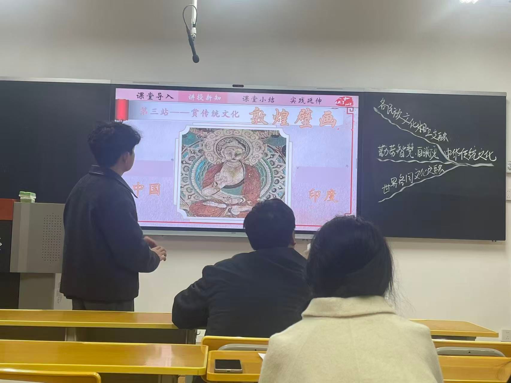 本次活动创新设置“学长示范”环节。优秀学长以“正确认识中华传统文化”为主题进行模拟授课,完整展示教学流程与互动技巧,为学员提供生动范例。随后,指导教师围绕PPT逻辑、知识点梳理、问题设计等方面展开点评,并提出案例贴近生活、互动分层推进等建议,帮助学员理清思路。示范结束后,指导教师紧扣授课内容,从PPT逻辑串联、知识点层级梳理、课堂问题梯度设计等方面进行细致点评,在肯定亮点的同时,也提出了案例应更贴近生活实际、互动环节可分层推进等具体建议,助力学员理清教学思路。