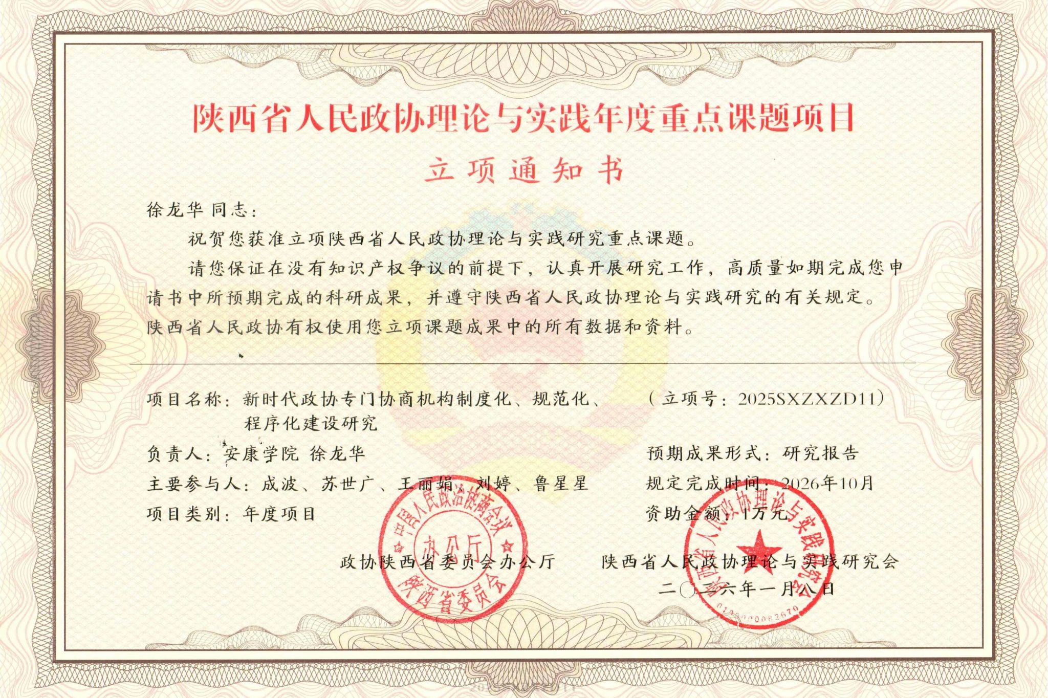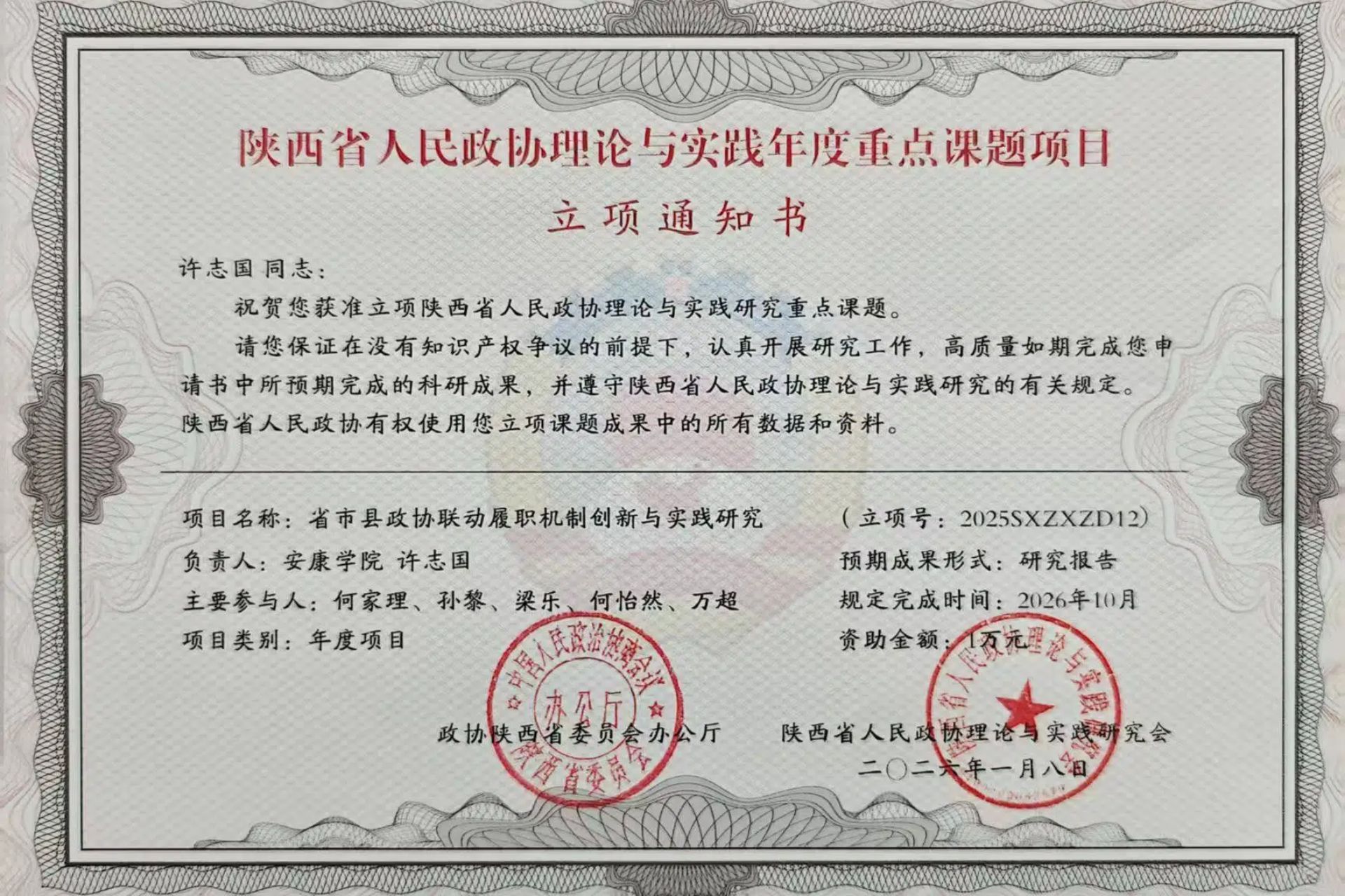 近日,公司陕西省人民政协理论与实践研究基地组织申报的《省市县政协联动履职机制创新与实践研究》与《新时代政协专门协商机构制度化、规范化、程序化建设研究》两项课题,成功获批2026年度陕西省人民政协理论与实践重点课题项目,标志着基地在人民政协理论研究领域取得新的突破。