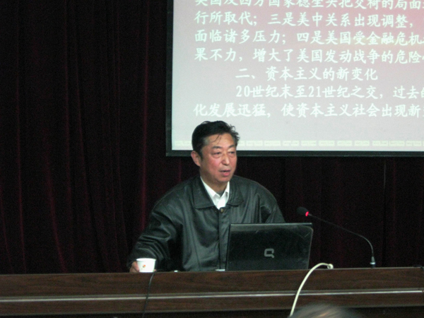 郭教授从当今世界形势的新变化、变化中的资本主义、变化中的社会主义等三个方面论证了当今世界社会主义与资本主义所发生的种种新变化。郭教授用幽默的语言、渊博的学识赢得听众的阵阵掌声。
