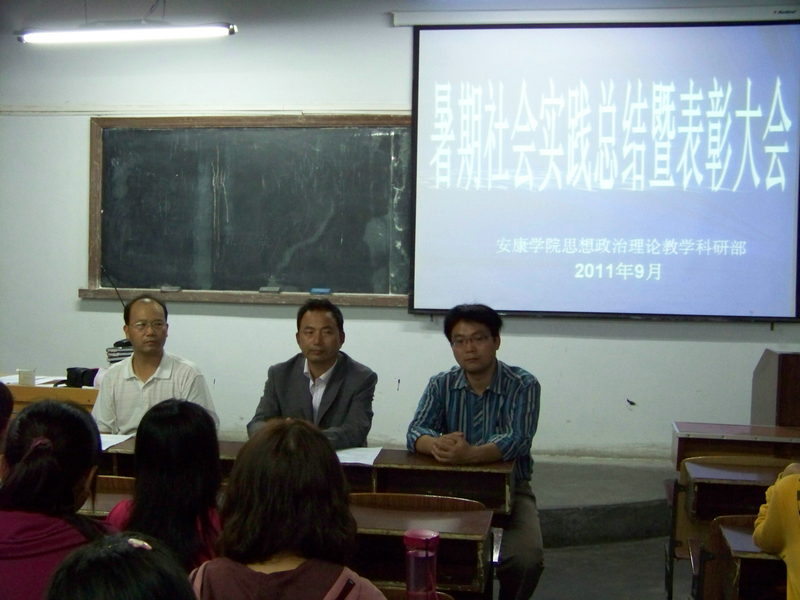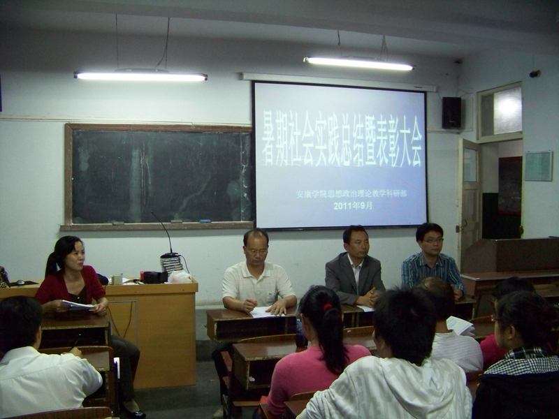 2011年9月15日晚7:30思想政治理论教学科研部在2303教室召开2011年思想政治理论课暑期社会实践表彰会。思想政治理论教学科研部主任何家理、思想政治理论教学科研部党总支书记谢安国、公司团委书记鲁延安、思想政治理论教学科研部副主任吴亚娥、2011年思想政治理论课暑期社会实践带队教师、毛泽东思想和中国特色社会主义理论体系教研室成员及部分员工参加会议。