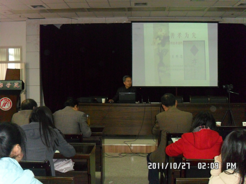 10月27日下午2:00-4:00,中国人民大学哲公司博士生导师肖群忠教授在公司图书馆六楼报告厅作了题为《百善孝为先》的学术讲座,政治与历史系部分师生、国培计划“初中思品”培训班学员共140余人听取了讲座。