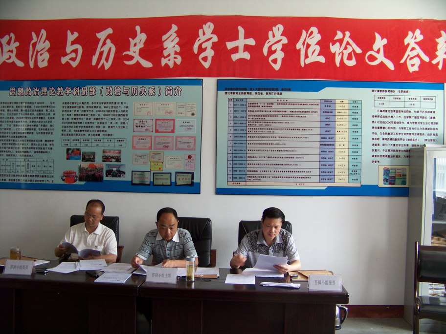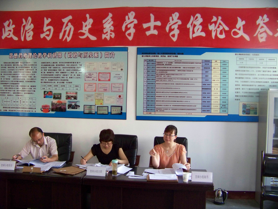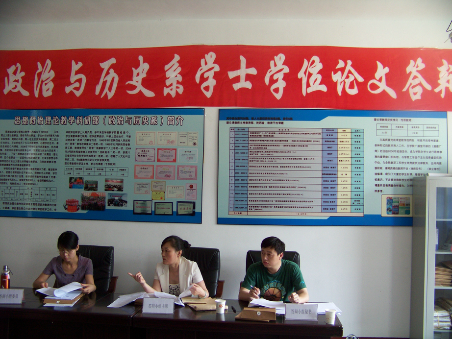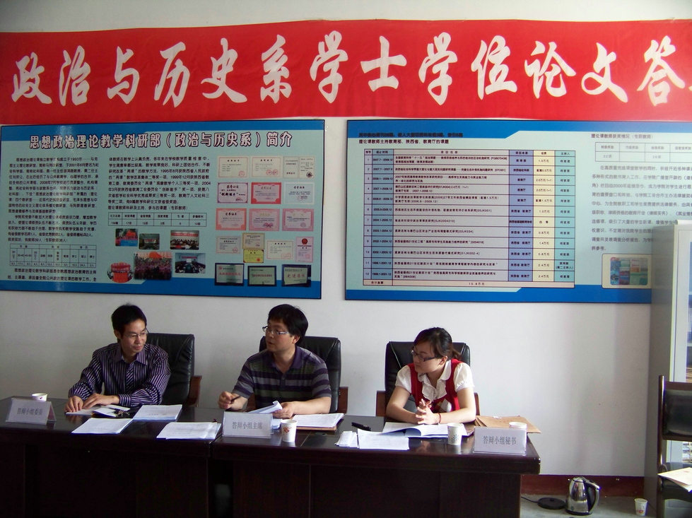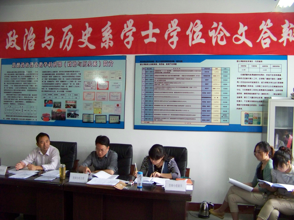 2012年5月18日至20日,政治与历史系在8113办公室举行了2012届本科毕业生论文答辩会。本次答辩会共分六个小组,答辩委员会主任由政史系主任何家理教授担任,政史系党总支书记谢安国副教授、调研员吴大康副教授、系副主任吴亚娥副教授、教研室主任陈绍斌副教授、教研室主任项晓静副教授、教研室主任罗春霞副教授担任答辩委员会委员。