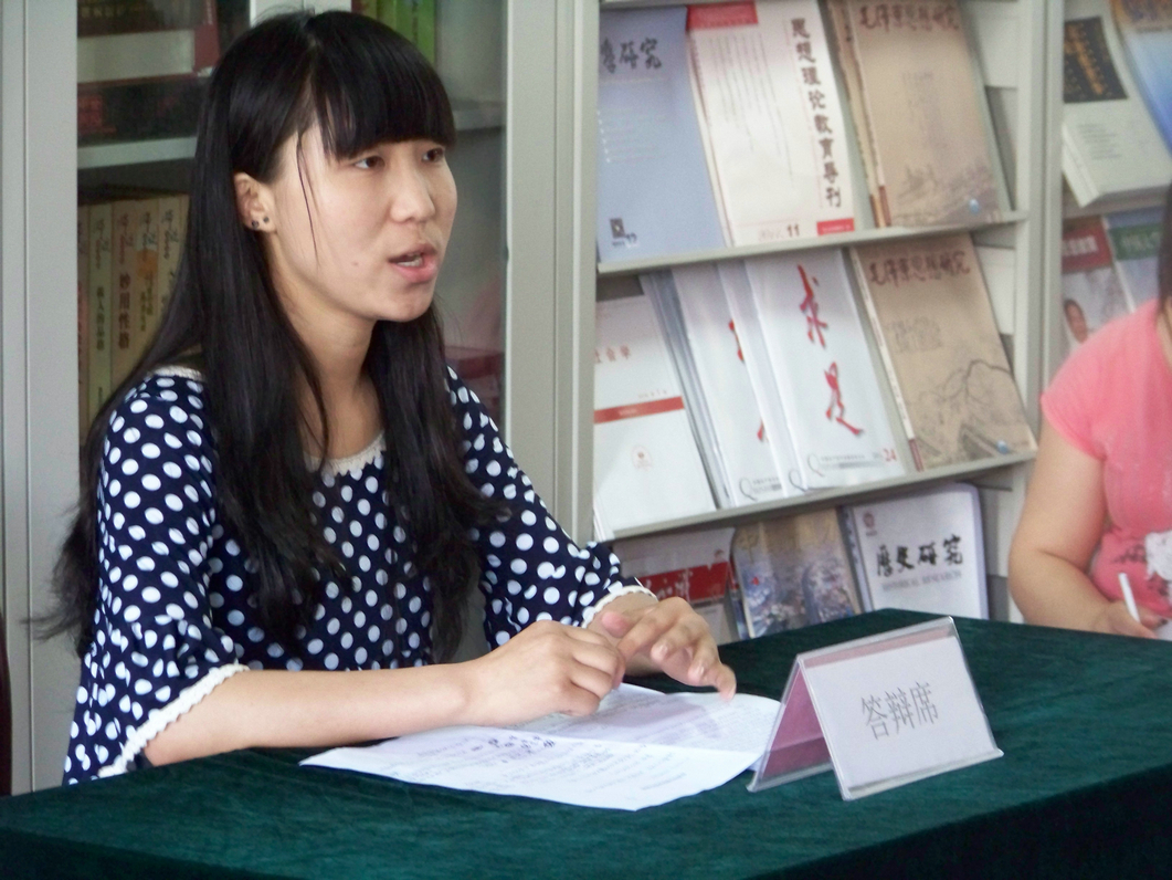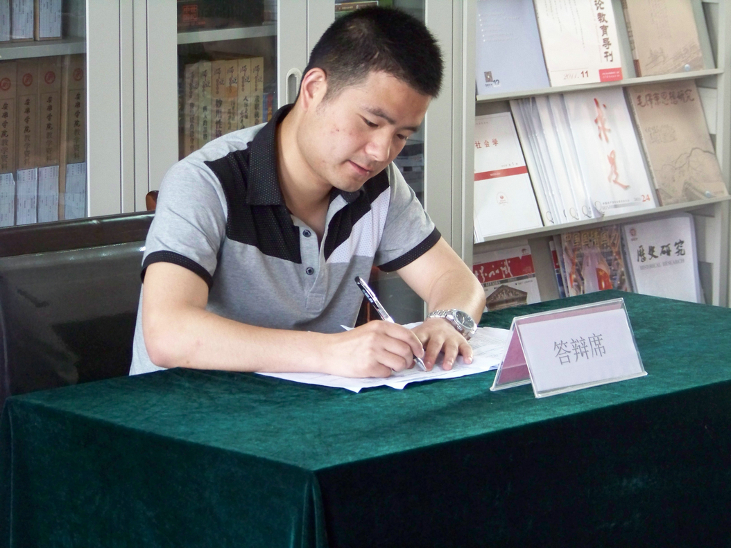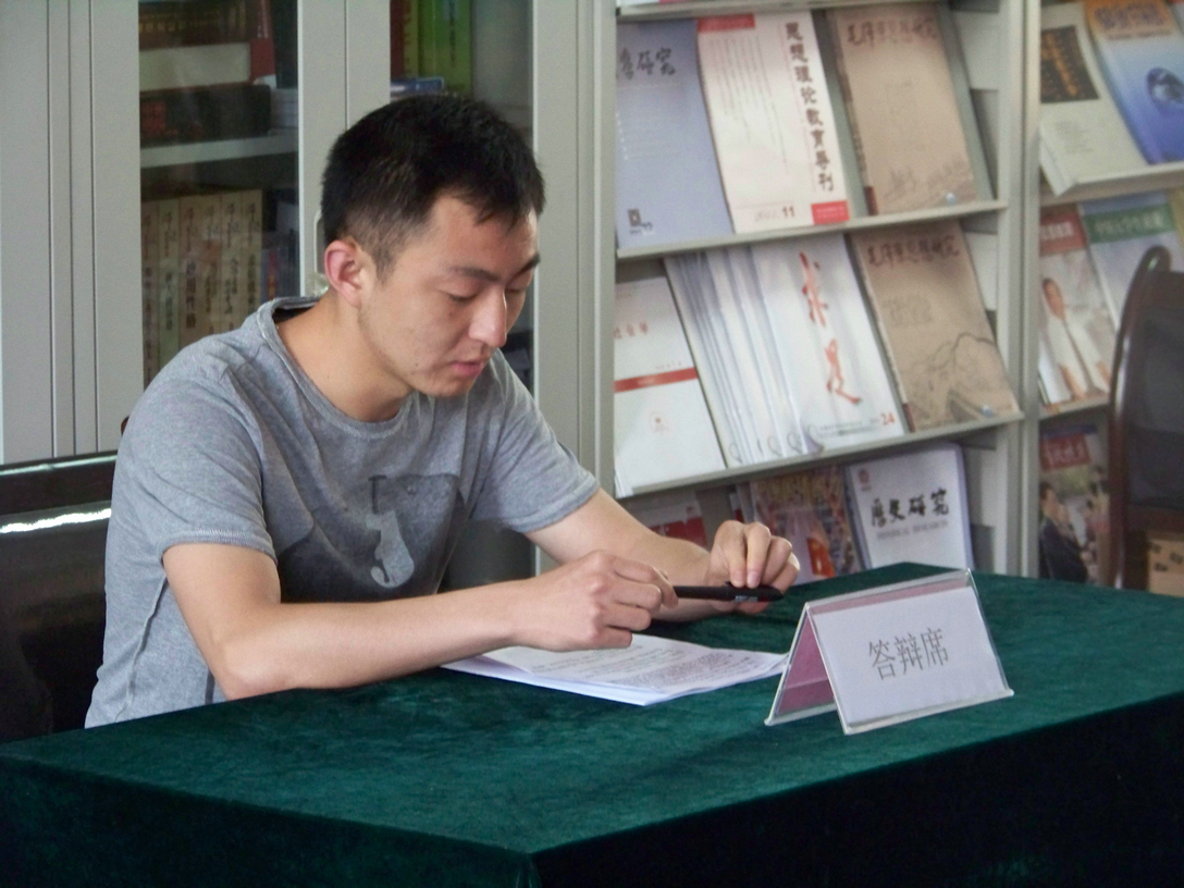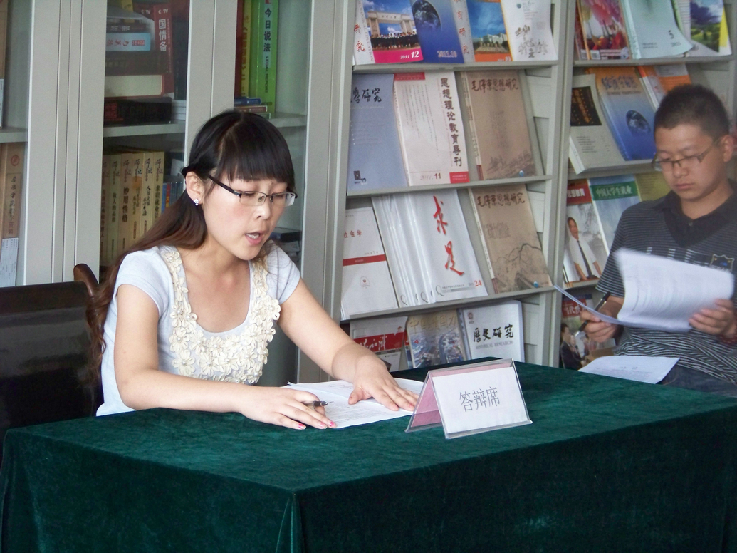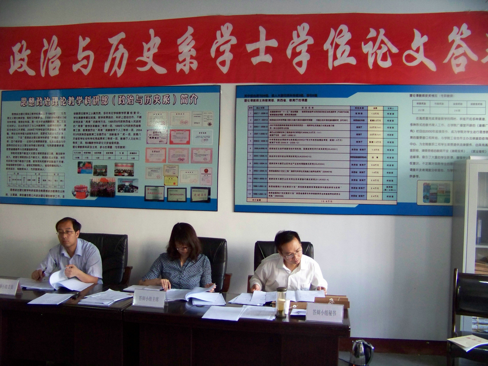 2012年5月18日至20日,政治与历史系在8113办公室举行了2012届本科毕业生论文答辩会。本次答辩会共分六个小组,答辩委员会主任由政史系主任何家理教授担任,政史系党总支书记谢安国副教授、调研员吴大康副教授、系副主任吴亚娥副教授、教研室主任陈绍斌副教授、教研室主任项晓静副教授、教研室主任罗春霞副教授担任答辩委员会委员。
