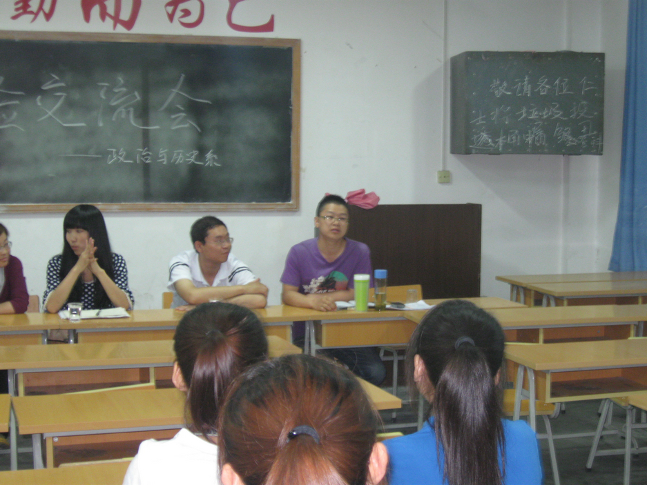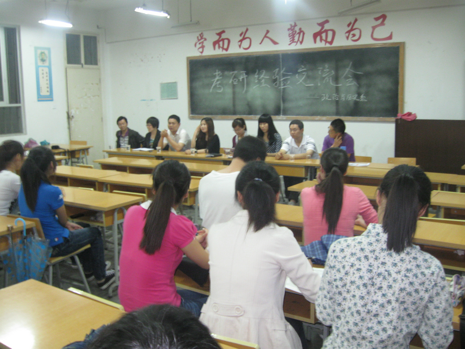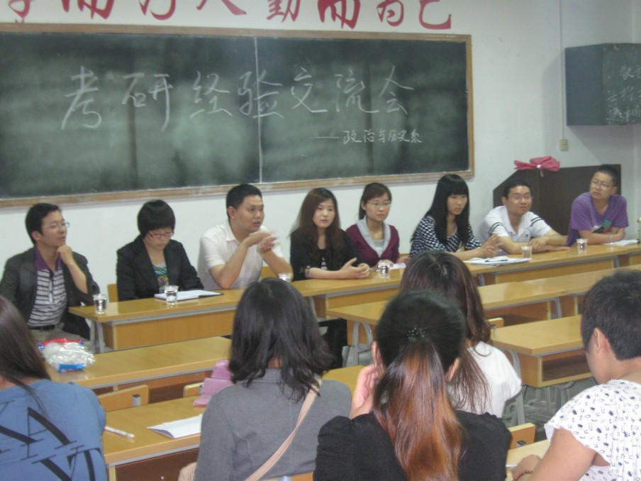 为正确引导和提升我系2009级本科专业员工的考研积极性和热情,2012年5月21日晚7点30分在8201教室举办了“考研经验交流会”。交流会由政史系副主任单林波主持,09级辅导员孙敏老师、班主任郑治国老师及今年已考取研究生的梁正科、卫攀虹、王建琴、张彦云、张鹏5位同学和2009级有考研意向的30多位同学参加了交流会。