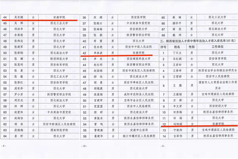 据悉,陕西省法治人才库下设资深法治专家库、法治专家库、中青年法治人才库、涉外法治人才库等四个子库,此次共有177人入选。吴亚娥入选法治专家库,单林波、冯炜娟入选中青年法治人才库。在非省会高校中公司入选人数位居前列。