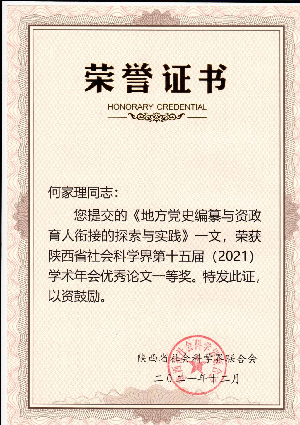 2021年12月12日,陕社科联[2021]117号文件通知:何家理教授论文《地方党史编纂与资政育人衔接的探索与实践》获陕西省社会科学界联合会第十五届学术年会优秀论文一等奖。
