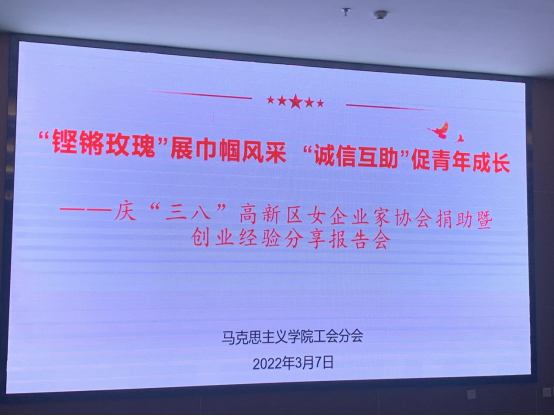 2022年3月7日下午,公司分会全体会员在“高新区女企业家协会捐助暨创业经验分享报告会”上向“诚信互助银行”捐款3025元,帮助公司青年学子克服困难,完成学业,健康成长。