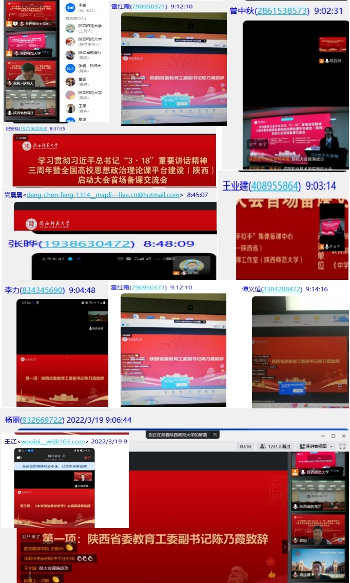 由全国高校思政课“手拉手”集体备课中心(陕西师范大学——陕西省)、全国高校思政课名师工作室(陕西师范大学)、陕西师范大学主办的学习贯彻习近平总书记“3·18”重要讲话精神三周年暨全国高校思想政治理论课平台建设(陕西)启动大会首场备课交流会于2022年3月19日在西安召开。公司毛泽东思想和中国特色社会主义理论体系概论教研室全体教师以线上方式全程参与此次会议。
