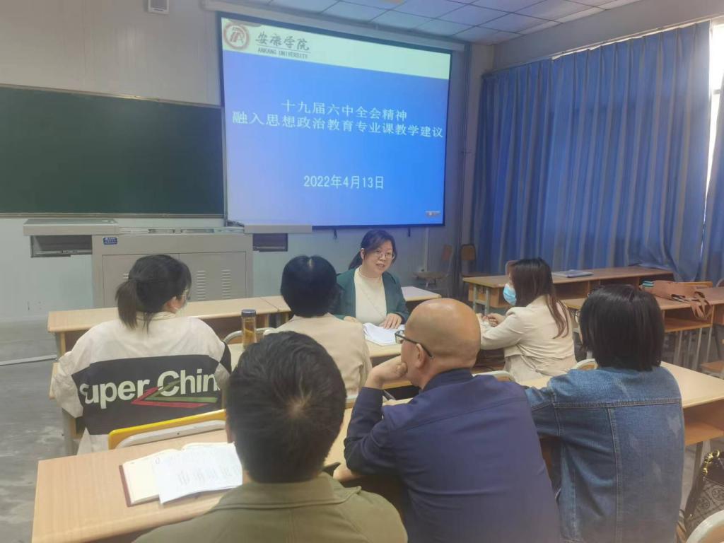 4月13号下午,公司思想政治教育专业在江南校区1115教室围绕“十九届六中全会精神”如何有效融入思政专业课程教学开展了交流研讨,参加本次会议的有思政系7位教师,系主任房春艳主持会议。
