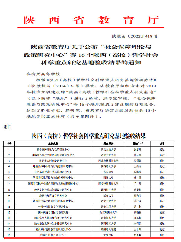 5月20日,陕西省教育厅公布了“陕西(高校)哲学社会科学重点研究基地”验收结果,我院何家理教授担任主任的陕南乡村振兴研究中心经过历时3年的建设,经2022年4月29日教育厅专家组进校实地考察验收,完成了建设期所设计的各项目标任务,通过验收。本次验收,共有“社会保障理论与政策研究中心”等16个基地达到验收标准。