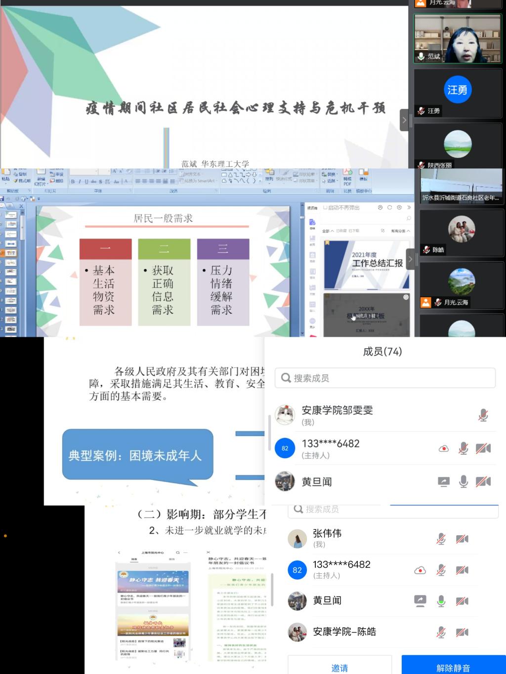 为全面助力陕西广大一线社会工作者充分发挥社会工作专业作用,提供疫情防控资源链接、心理疏导、情绪支持等服务,在民政部慈善事业促进和社会工作司指导,联合国儿童基金会支持下,4月9日,由中国社会工作学会执行、陕西省社会工作协会协办的“携手抗疫·陕西社会工作专业服务支持计划——培训板块”--携手抗疫·陕西社会工作专业培训(第一期)如期在腾讯会议上举行。公司社工系高度重视,积极组织教师参加线上培训。