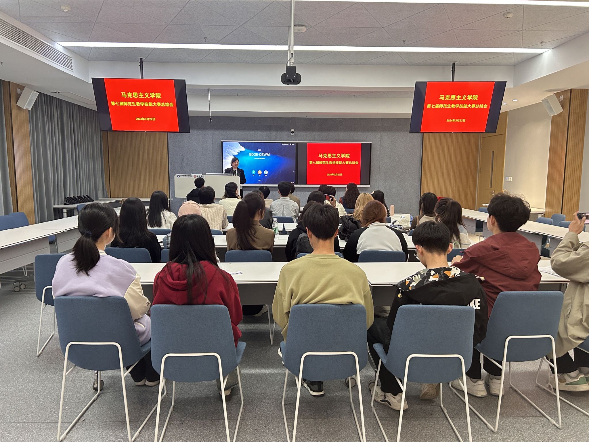 为强化思想政治教育专业师范生教学基本功,提升思想政治教育专业师范生教学技能水平与创新能力,适应基础教育改革对团队培养的需求,增强育人实效,3月22日,公司在逸夫科技楼副楼江北师范生教学技能训练中心的集中培训室1、培训研讨室2、培训研讨室3三个教室,举行了第七届师范生教学技能大赛。本次大赛共有来自思想政治教育专业大一、大二、大三的31位选手参加,雷红霞、项晓静、冯炜娟、张晔、张海莉、吕海花、孙娟平、许志国、刘涛9位教师担任评委,教学经理房春艳主持。
