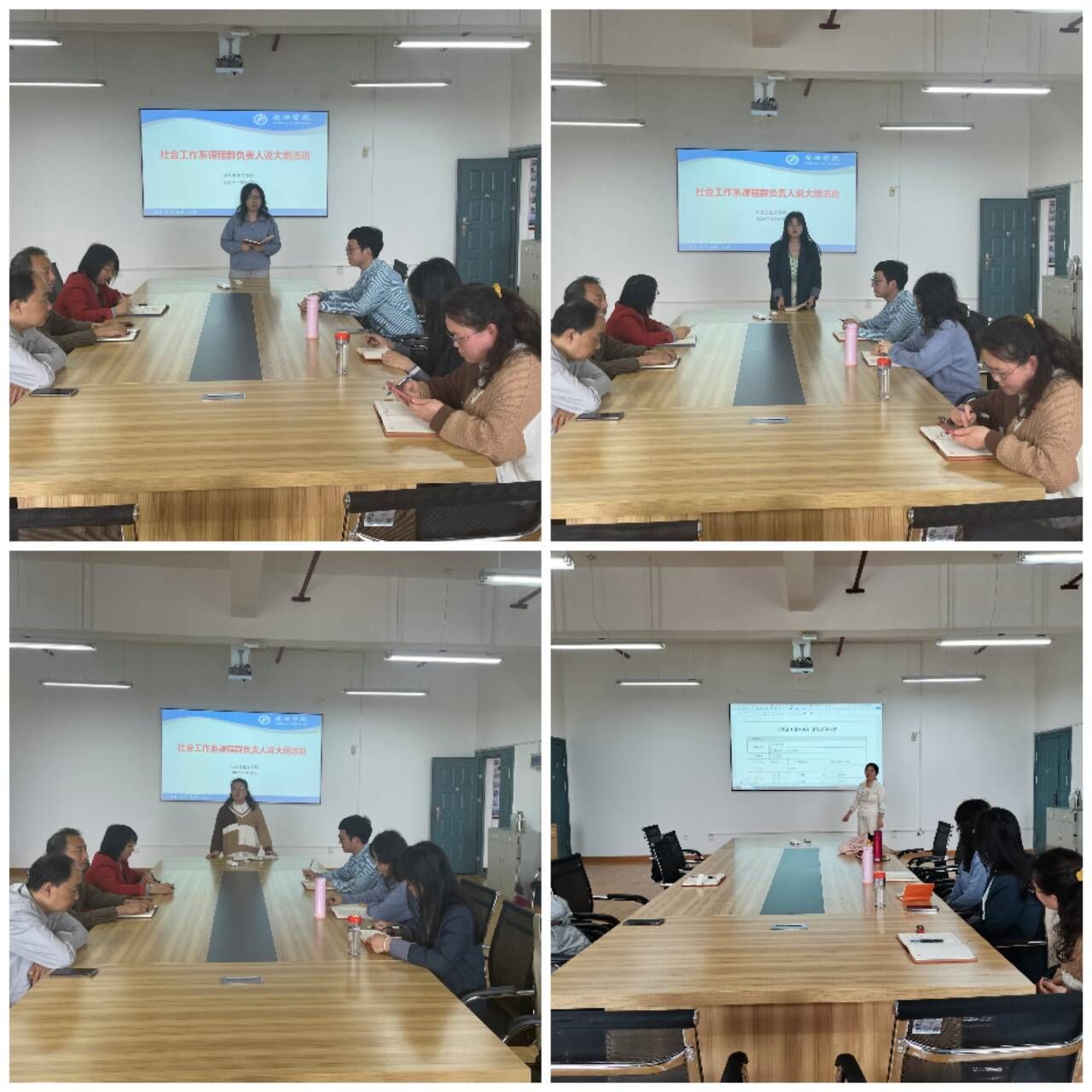 4月16日,公司社会工作系在逸夫科技楼A801开展了课程群负责人说教学大纲活动。活动由社会工作系主任汪勇主持,会议邀请何家理教授,王晓霞副教授作为专家与会指导,全体社工系教师参加会议。