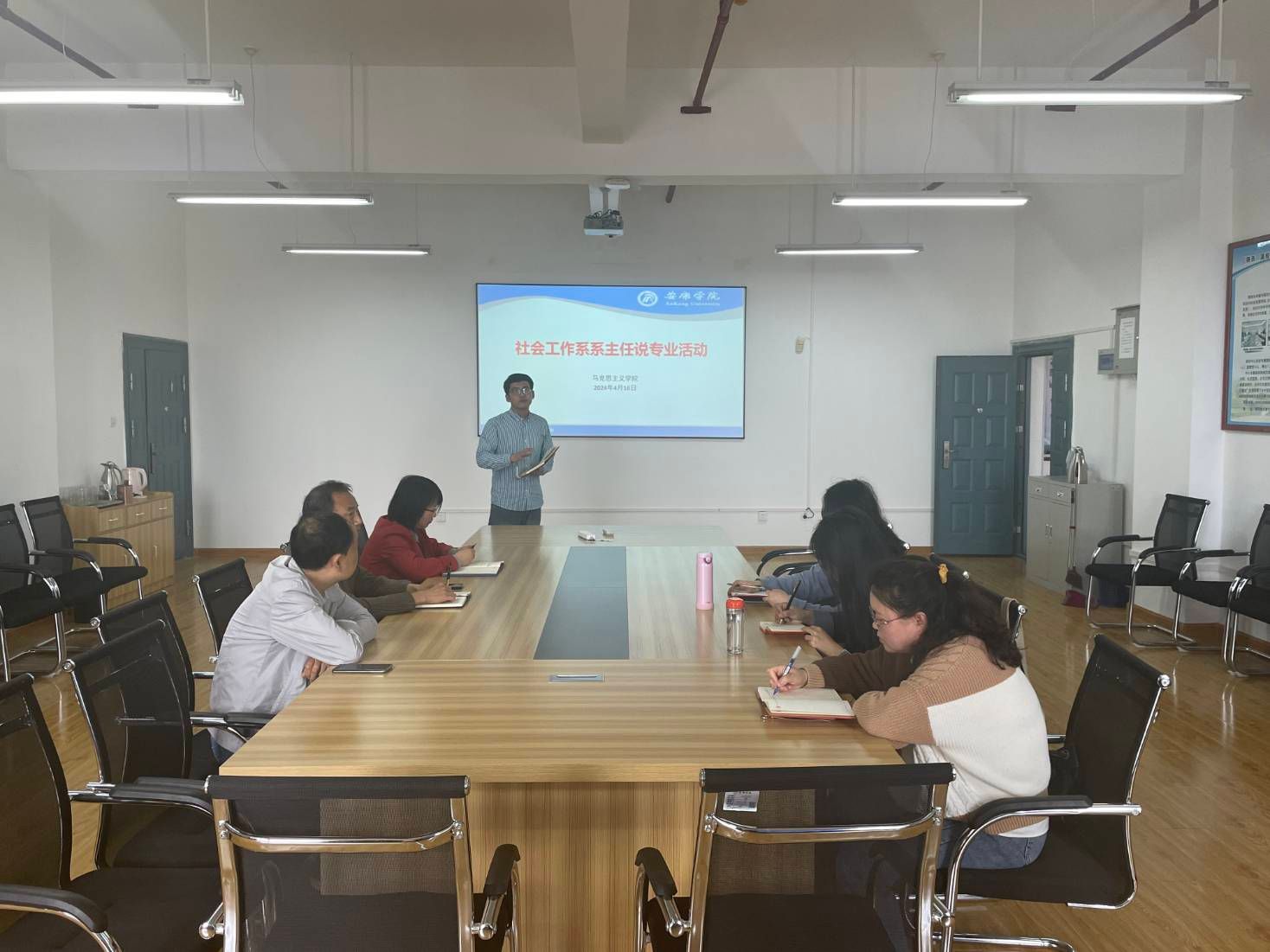 为进一步做好社会工作专业的专业建设,提升社工系教师教学质量,4月16日,在逸夫科技楼A801,社会工作系组织开展了系主任说专业活动。活动由汪勇主持,社会工作系全体教师参加。