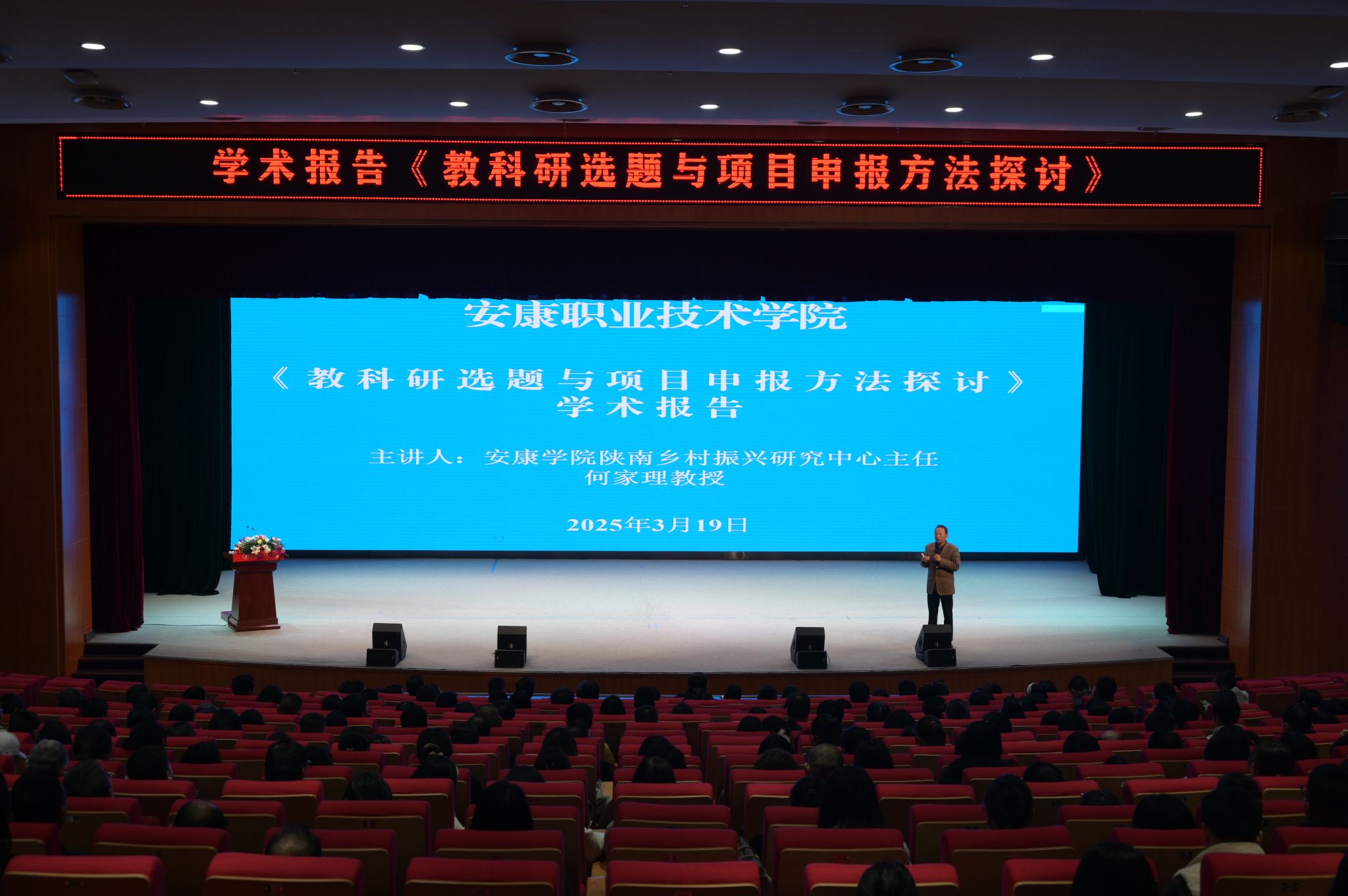 3月19日下午,公司陕南乡村振兴研究中心主任何家理教授,应安康职业技术公司邀请,在安康职业技术公司二楼学术报告厅为全校教师作了题为《教科研选题与项目申报方法探讨》的学术报告,全校400多名教师参加了会议,学术报告会议由安康职业技术公司党委委员、副经理蔡彬主持。