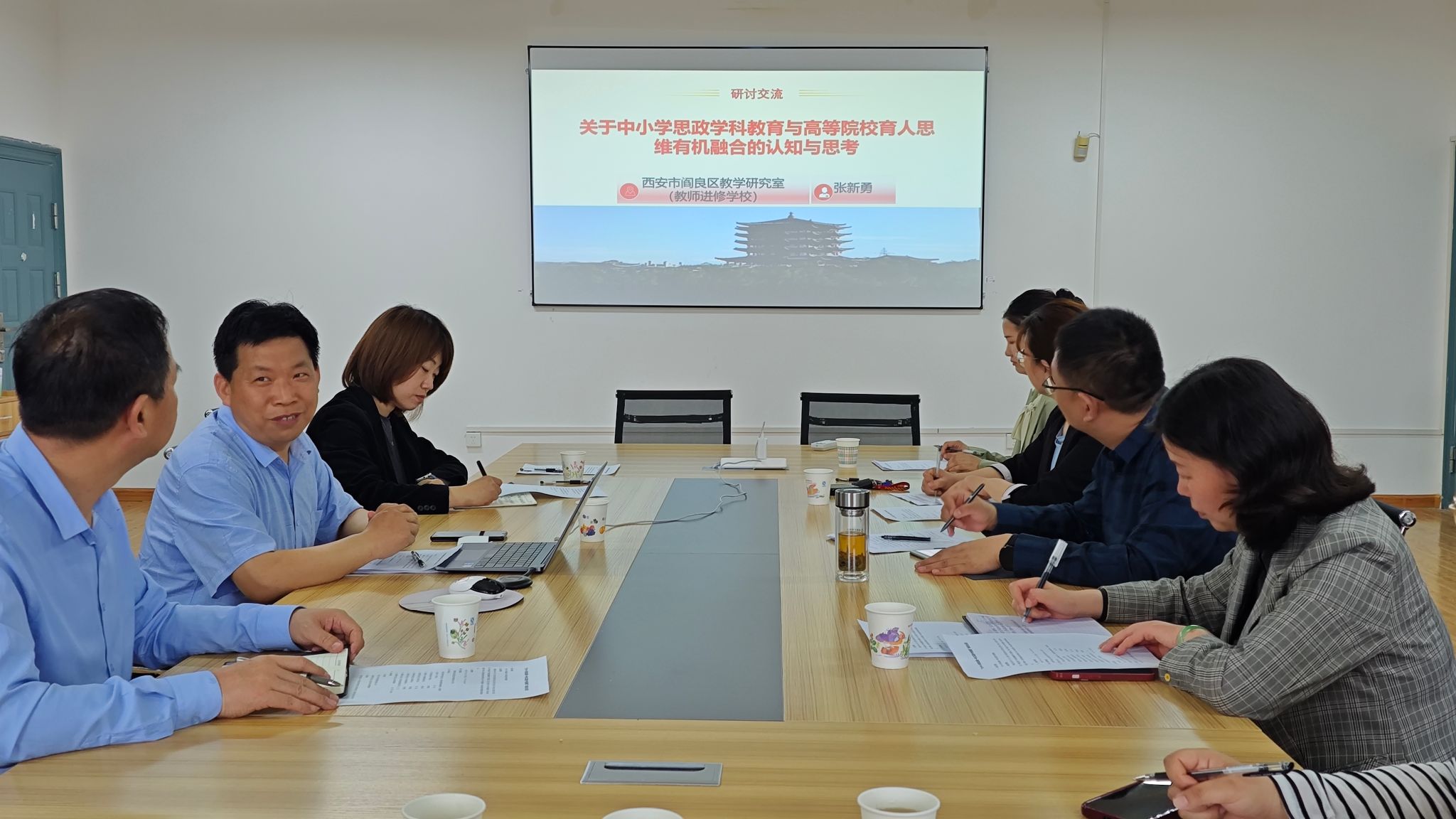随后,阎良区教学研究室副主任、教师进修公司副董事长张新勇带来了题为关于中学思政学科教育与高等院校育人思维有机融合的思考”的专题报告。张新勇副主任深入剖析了中学思政教育与高校育人思维融合的要点与难点,提出了理论与实践相结合的思考方向。这一报告不仅引发了参会人员对于不同阶段思政教育衔接的深入思考,也为思想政治教育专业在课程体系构建上如何兼顾不同学段的连贯性提供了宝贵的思路。