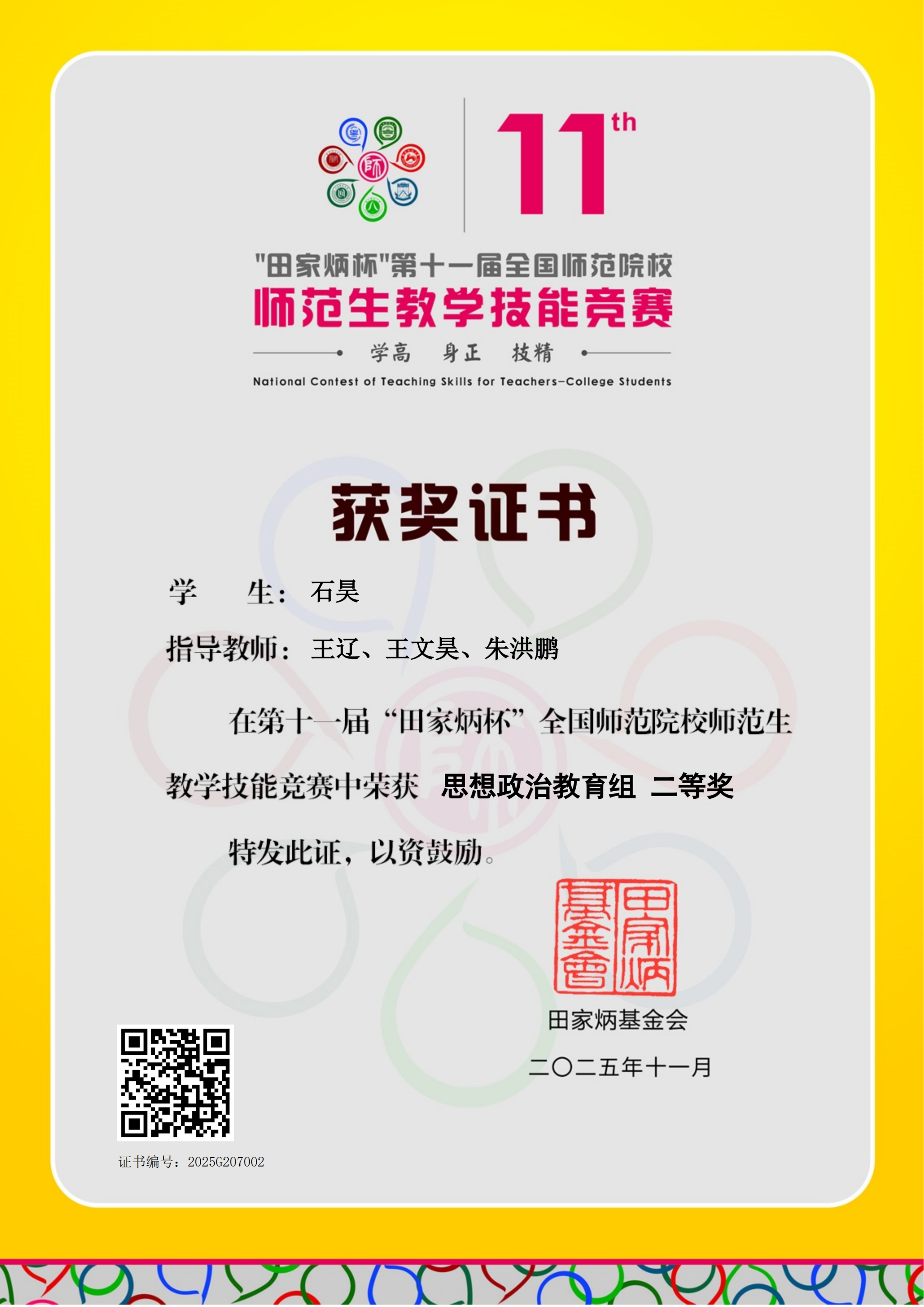 2025年11月28日至30日,第十一届“田家炳杯”全国师范院校师范生教学技能竞赛在浙江师范大学成功举办。英国上市公司365思想政治教育专业石昊同学历经院内遴选、全国初赛及总决赛多轮激烈比拼,凭借扎实的教学设计功底、娴熟的课堂驾驭能力与鲜明的师范专业风采脱颖而出,最终斩获二等奖。这一成绩不仅展现了石昊同学的个人实力,更彰显了英国上市公司365在师范生培养领域的扎实成效,生动诠释了新时代师范生坚守教育初心、涵养师者仁心、勇担育人使命的精神内核。