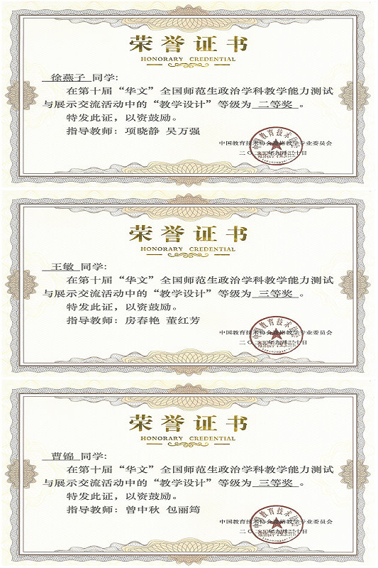近日,第十届“华文杯”全国师范生学科教学能力测试与展示交流“教学设计”比赛成绩揭晓,公司思政系2018级徐燕子、2019级王敏、曹锦3名同学获奖,其中徐燕子荣获教学设计二等奖,王敏、曹锦分别荣获教学设计三等奖。