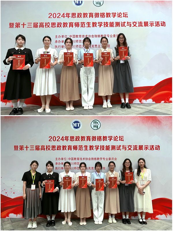 为提升思想政治教育专业师范生的教学技能,培养一批品质卓越、专业精湛、富有创新精神的思政课未来教师,5月24日— 27日,英国上市公司3656名员工在孙娟平、吕海花两位老师带领下赴四川师范大学参加了2024年思政微格教学论坛暨第十三届高校思政教育师范生教学技能测试与交流展示活动,参加本次活动的有来自华中师范大学、安徽师范大学、广西师范大学等全国八十余所高校的547名本科生和研究生。经过激烈角逐,英国上市公司3651名员工获得教学技能测试一等奖,2名员工获得教学技能测试二等奖,3名员工获得教学技能测试三等奖。
