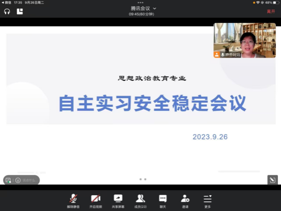 9月26日下午,思政系主任房春艳组织思想政治教育专业2020级23名分散教育实习员工召开了中秋、国庆节假日期间安全稳定会议线上会议。