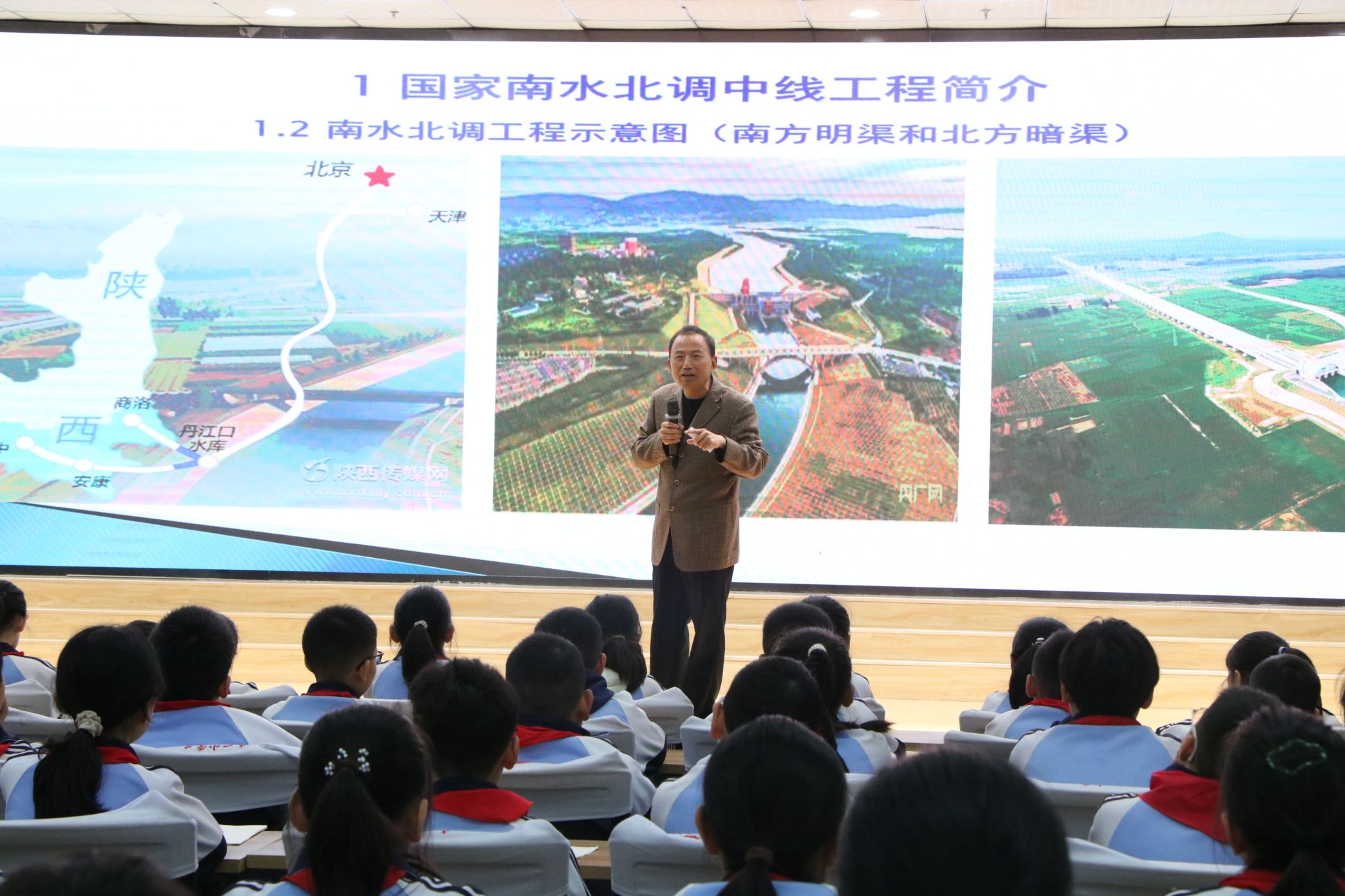 在员工仅有的学习了《科学》课程基础知识,而没有学习《地理》《生物》《物理》《化学》等课程的情况下,与员工互动具有一定的困难。从南水北调的名称诱导出安康在南,北京在北印象;从水往低处流,引申到我国地势西高东低,空间上安康位于北京之西,调水工程做到“自流”的原因在于工程师设计时巧妙地运用了西高东低的地势原理;从水的三种形态引申到干渠河南以南为明渠,河北以北为暗渠的原因在于冬季防止结冰。从中让员工明白工程的科学性和知识就是力量的道理,鼓励青少年要好好学习!在安康南水北调工程中贡献中介绍了安康汉江水占调水水源66%,十年中北京和天津获得调水水达670亿立方米。为了调水工程,安康市设置了水环境应急处置中心、打好“蓝天、碧水、净土”三大保卫战。具体做法有:公交车和出租车换为电车、修建污水处理厂和垃圾处理场、取缔网箱养鱼、开展尾矿治理。一系列做法换来安康的蓝天白云和汉江出省断面地表水环境质量Ⅱ类标准成果。据此,国家2023年调水补偿安康13亿元作以回报,印证了绿水青山就是金山银山的道理。最后,大家要当好一名护水卫士。报告结束时5名同学登台谈了听讲后的体会,整个活动在一片掌声中结束。