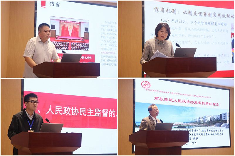 在交流发言阶段,陕西省政协理论与实践研究会长安大学研究基地副主任万金鹏作《中国特色全过程人民民主的唯物史观意蕴探赜》、西北大学研究基地主任李波作《人民政协在建设文化强国中的作用研究》、西安财经大学研究基地副主任高贵朋作《新时代政协民主监督的效能与提升路径探析》、公司研究基地主任何家理教授作《高校老员工推进人民政协功能宣传路径探索》交流报告。