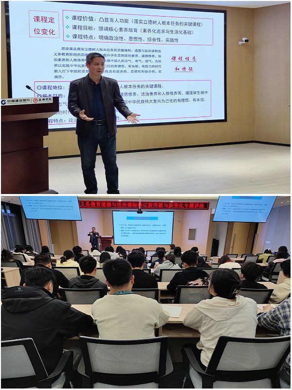 胡田庚教授基于比较的视角从“课程定位的变化”、“课程核心素养的凝练和课程目标的变化”、“课程结构和课程内容的调整”、“学业质量的提出”、“教学方式和评价方式的变化”和“大中小一体化建设的探索”等六个方面,分析讲授了义务教育道德与法治课程标准修订的新突破与新变化,并对比分析了义务教育道德与法治新旧课程标准的区别。最后,胡教授提出思政教师在教学过程中要做到习近平总书记提到的“六要”、“八个相统一”,在教学实践中逐步提升思政课的实效性。