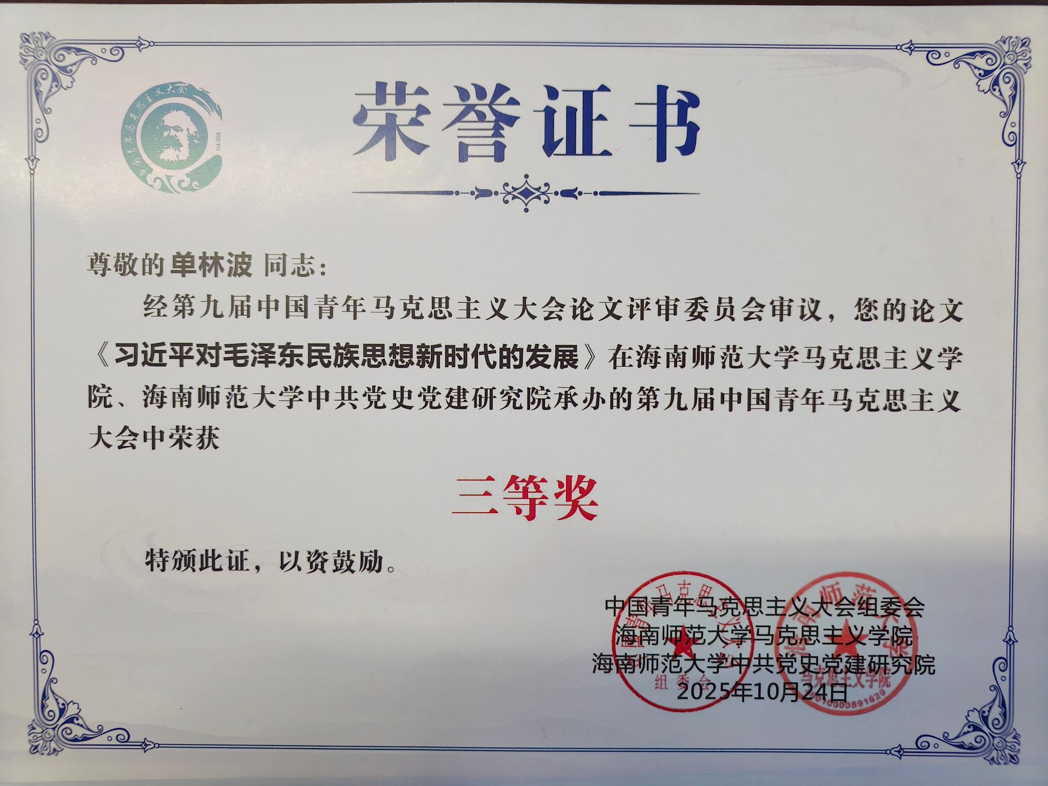 单林波老师论文荣获第九届中国青年马克思主义大会三等奖