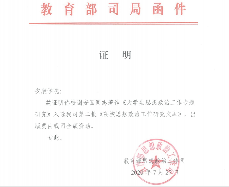 为深入学习贯彻习近平新时代中国特色社会主义思想和党的十九大精神,进一步推动全国高校思想政治工作会议精神落地生根,全面实施《高校思想政治工作质量提升工程实施纲要》,推出一批高水平成果,大力提升高校思想政治工作质量和科学化水平,教育部2018年开始实施《高校思想政治工作研究文库》建设项目。根据教育部《高校思想政治工作研究文库实施管理办法》和申报通知要求,公司谢安国教授申报的著作《老员工思想政治工作专题研究》,经个人申报、组织推荐、资格审查、专家遴选、出版审读等程序,成功入选第二批《高校思想政治工作研究文库》建设项目,教育部全额资助,最近由人民出版社出版发行,教育部思政司委托相关单位对入选《文库》成果进行宣传展示、推广转化。