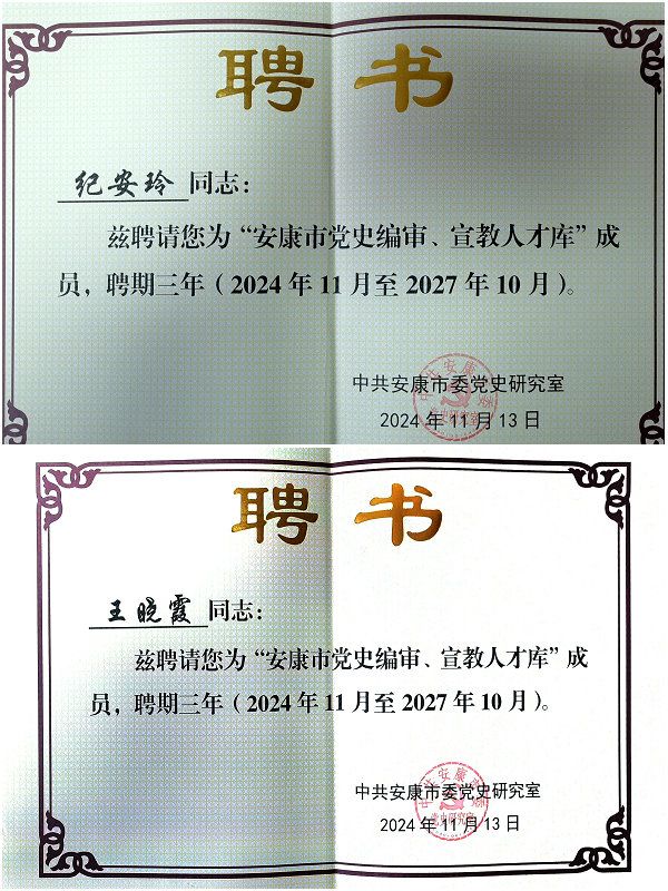 近日,中共安康市委党史研究室公布了“安康市党史编研、宣教人才库(第一批)”遴选结果,公司纪安玲、王晓霞两位教师获聘。