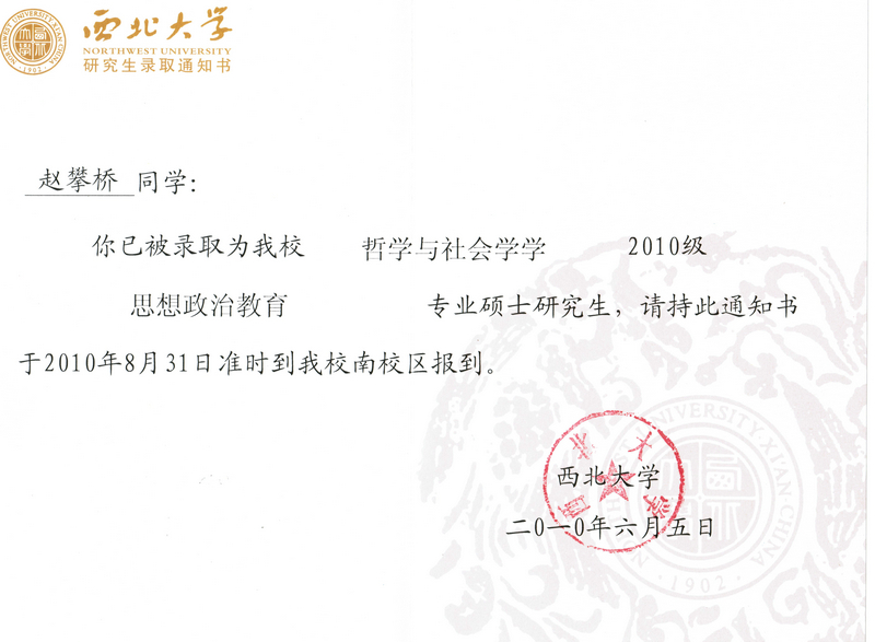 2008级政教“专升本”赵攀桥硕士研究生录取通知书