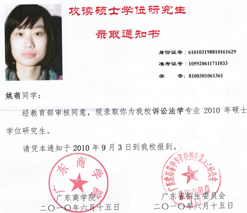 2006级思想政治教育本科员工姚萌硕士研究生录取通知书
