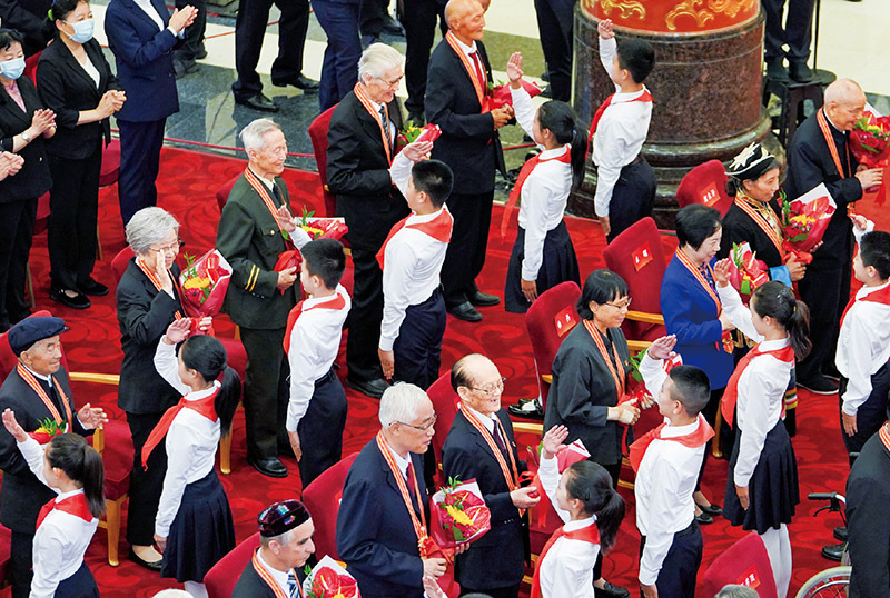 2021年6月29日,庆祝中国共产党成立100周年“七一勋章”颁授仪式在北京人民大会堂金色大厅隆重举行。这是少先队员向勋章获得者献花,敬礼致意。新华社记者 高洁/摄
