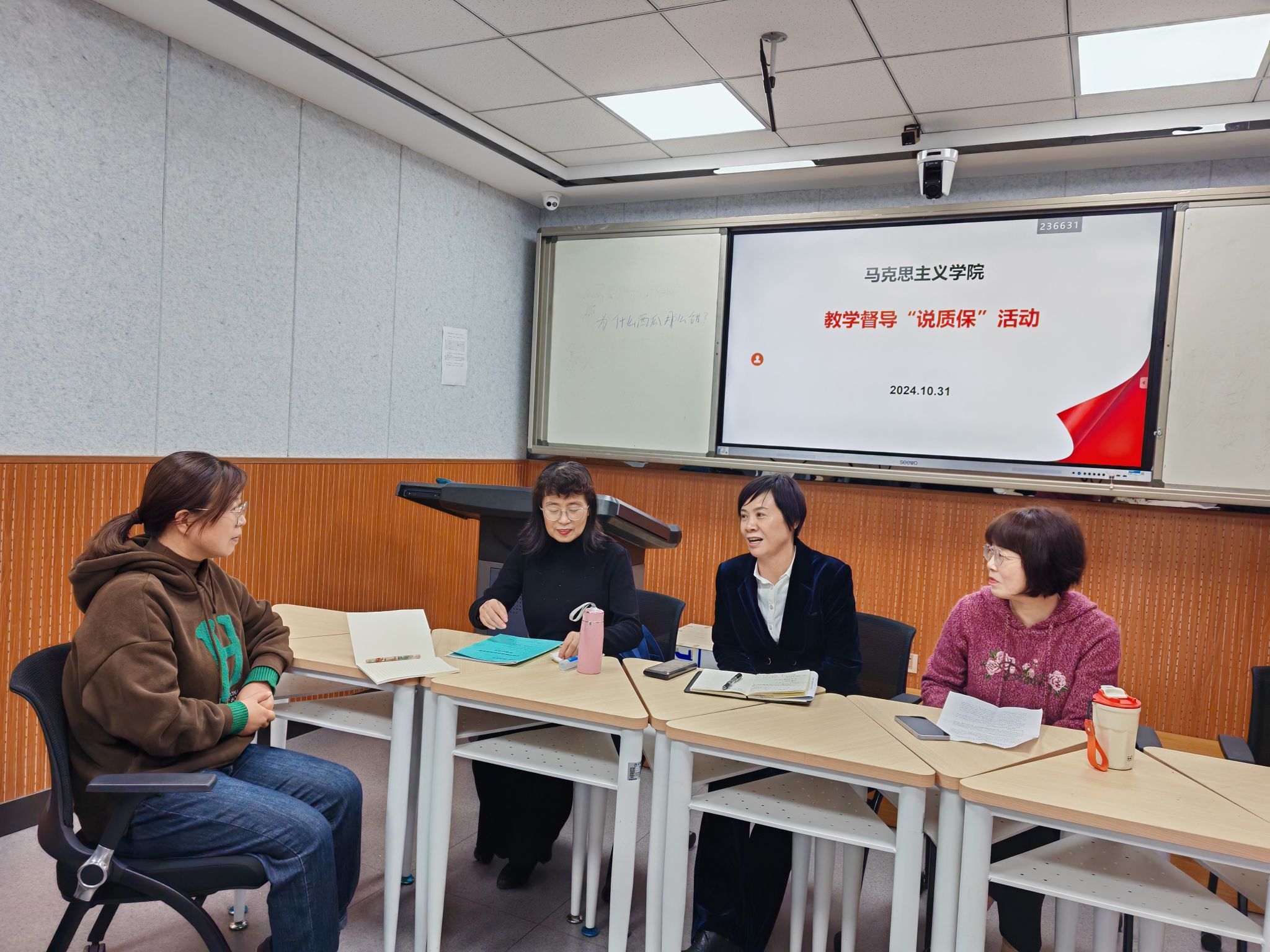 10月31日下午四点十分在江南校区4305教室,公司召开了教学督导质保活动。参加本次活动的有校级督导吴亚娥,院级督导纪安玲、项晓静,教学副经理房春艳以及思政系主任王辽。